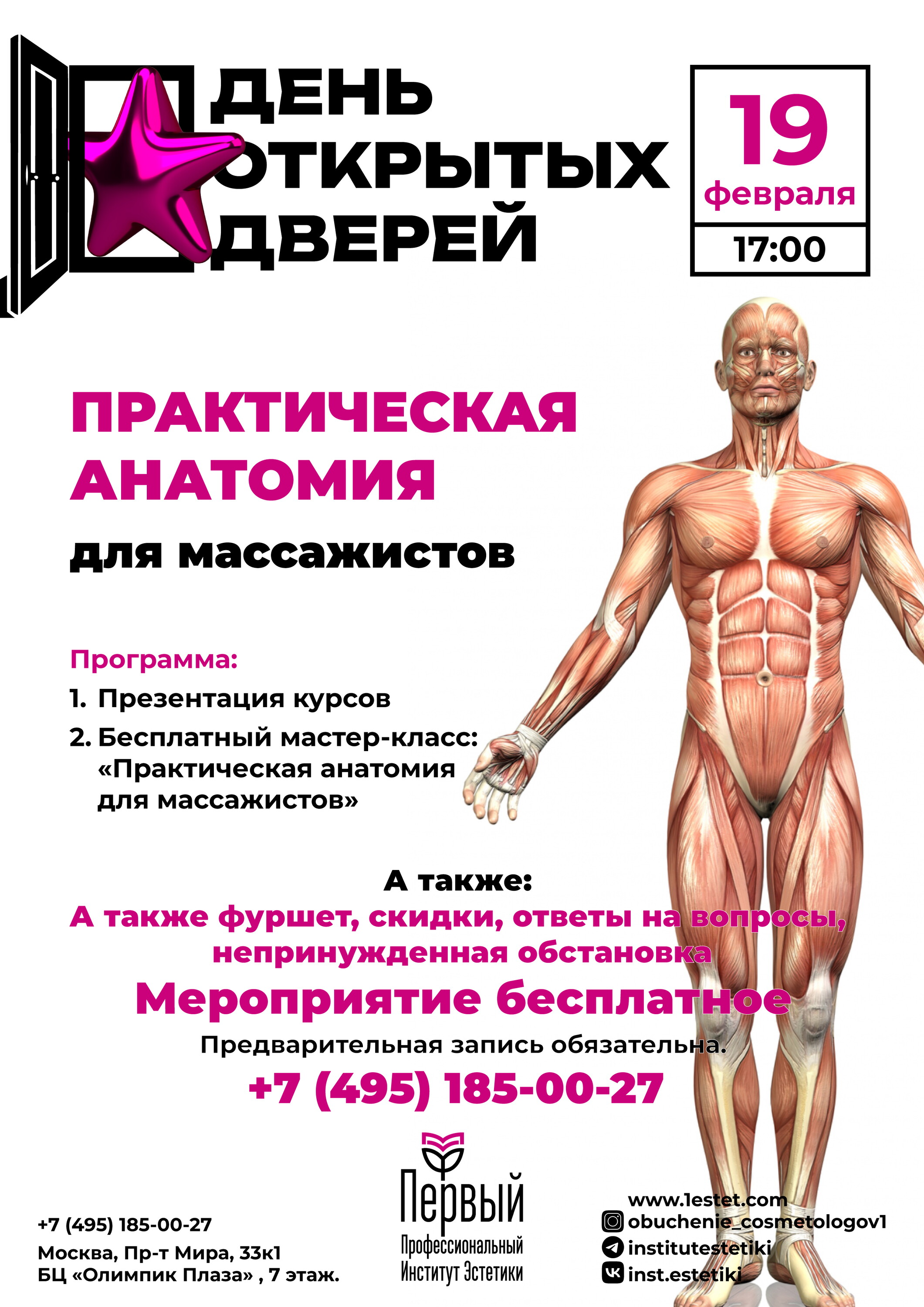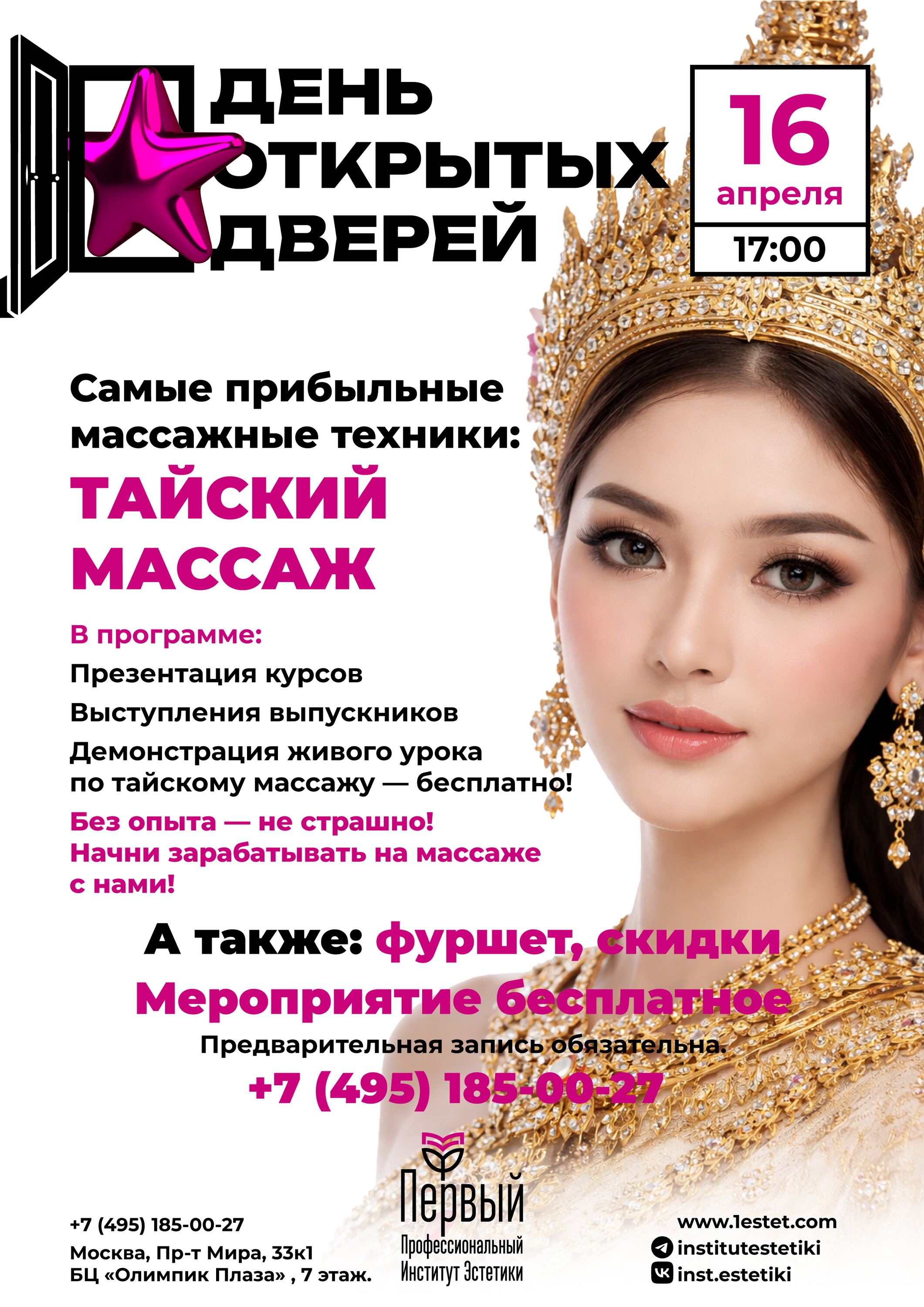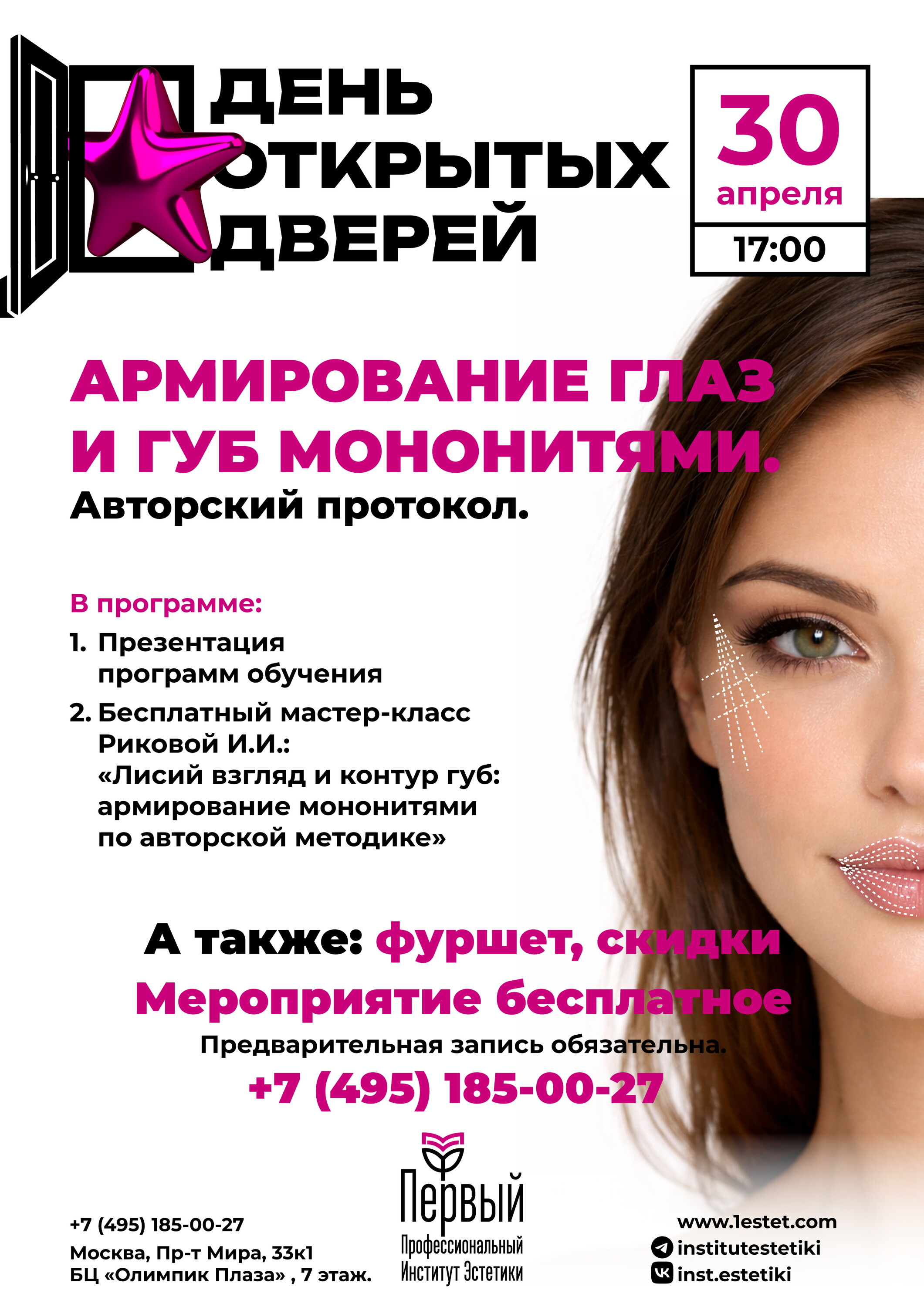 Преимущества: 17.03.22 была на дне открытых дверей в первом профессиональном институте эстетики. Выходили преподаватели - рассказывали о факультетах, самих занятиях, бывшие студенты - делились впечатлениями о своём обучении. Был фуршет и мастер класс по холодной плазме. Все очень понравилось! Атмосфера замечательная. Сразу после дня открытых дверей купила курс по косметологии на 576 часов